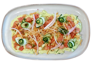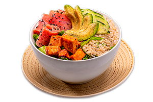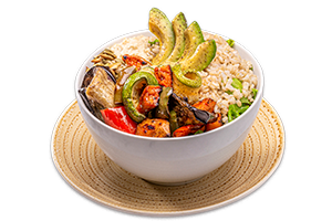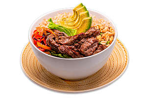 Nuestros bowls se preparan sobre una base de lechuga orgánica aderezada con vinagreta casera de limón amarillo y una porción de arroz integral (80 gr).