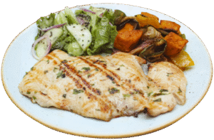 Pollo a la plancha con ensalada y vegetales o papas rostizadas