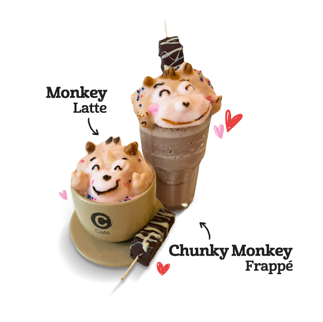Frappé de plátano fresco con chocolate y brocheta de panqué de plátano y chocolate con nuestro Arte Latte 3D® de temporada.